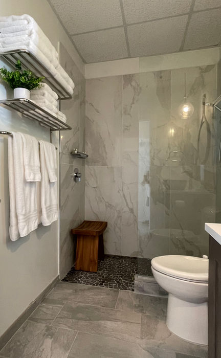 Our spa like bathroom has a large open shower with multi-function showerhead and is fully stocked with robes, linens, lovely personal care products, hairdryer and first aid kit.