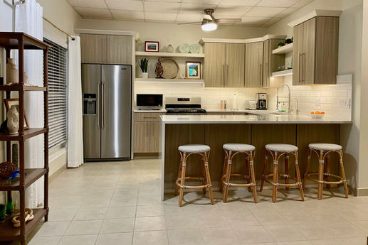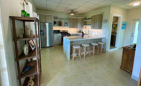 The fully stocked kitchen has new custom cabinets, stainless steel appliances and white quartz countertops. The in-unit reverse osmosis system, with remineralizer, eliminates the need for bottled water and the refrigerator has additionally purified water and ice dispenser. Enjoy your meals at the large peninsula or on the veranda for a sunset dinner.