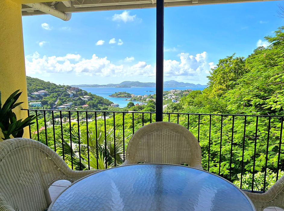 The oversized veranda features gorgeous views of Pillsbury Sound and St Thomas in the distance, and due to its western orientation has incredible sunsets all year round. The veranda has a dining table with chairs, sun loungers, patio rockers, and curtains which can be drawn to keep cool in the late afternoon sun.